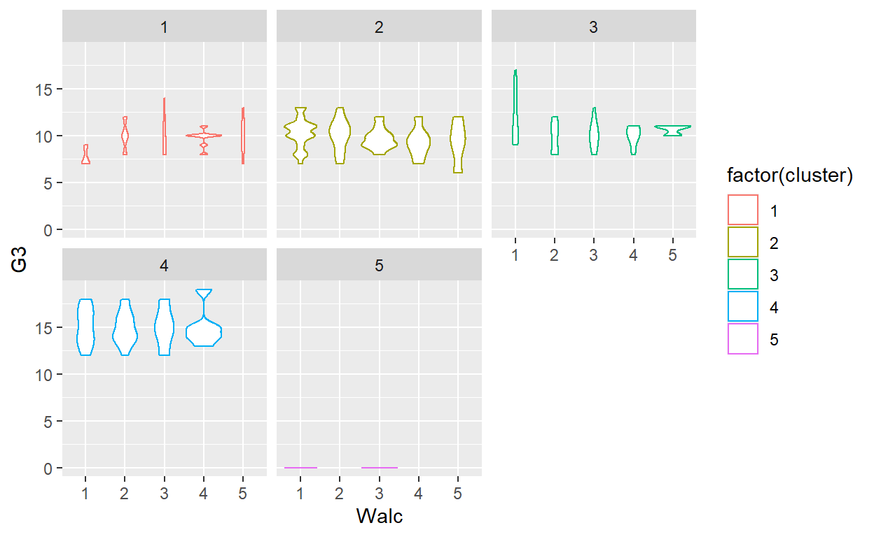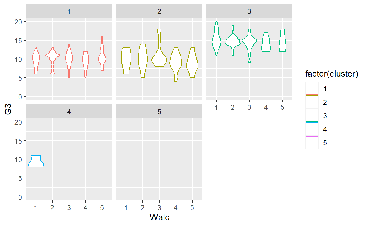 ggplot(GP_Math, aes(x = Walc, y = G3, color = factor(cluster))) +